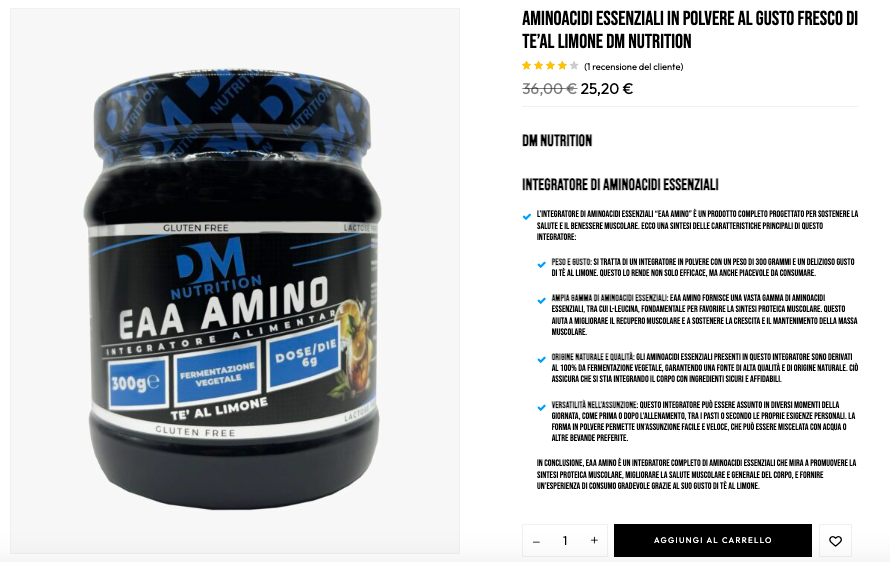 - Peso e Gusto: EAA AMINO viene fornito in polvere, con un peso di 300 grammi e un piacevole gusto di tè al limone, che lo rende non solo efficace, ma anche piacevole da consumare.